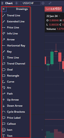 Users can utilize drawing items and tools for technical analysis, annotating and highlighting trends on the chart.