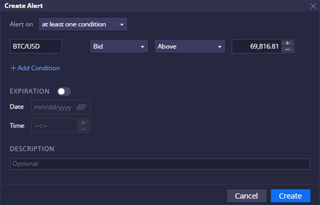 This feature allows users to establish price alerts based on specific conditions. Users can define multiple conditions, each comprising a selection of instruments, bid or ask price, comparison operator, and price level. Alerts can be triggered by meeting either 'at least one condition' or 'all conditions.' Users can also set expiration rules by specifying date and time values.