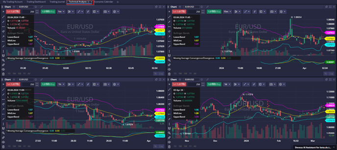 The trading terminal allows users to create personalized workspaces tailored to their specific trading preferences. These dynamic environments enable users to arrange widgets that support their strategies. For example, the default Technical Analysis workspace includes four chart widgets preloaded with indicators such as Bollinger Bands and MACD, offering tools to analyze market volatility and momentum across multiple timeframes.