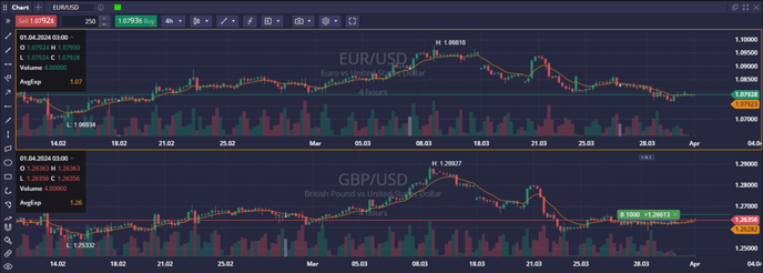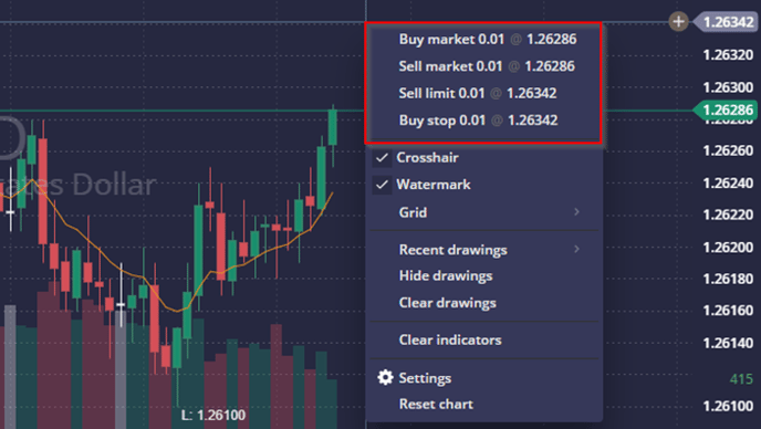 Alternatively, right-clicking on the chart brings up a menu with four buttons: two for Market Buy/Sell orders and two for Stop/Limit pending orders