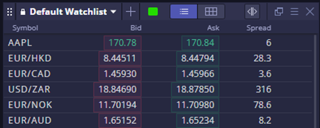 Enable the watchlist widget by clicking or dragging it into the workspace. The default broker-defined watchlist cannot be edited, but users can create custom lists.