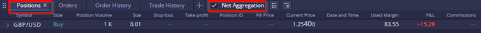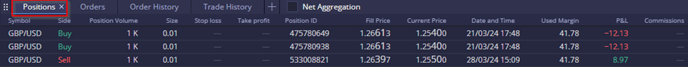 The Positions widget displays all open positions for the trading account.