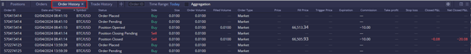 The Order History widget displays all orders initiated by the trading account, detailing the sequential steps from order placement to position closure.