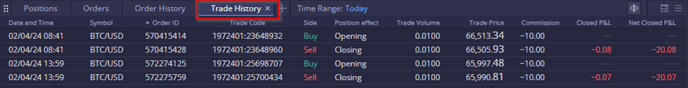 The Trade History widget presents past trades executed by the trading account, including opening and closing positions. Users can search for specific trades by selecting the appropriate time.