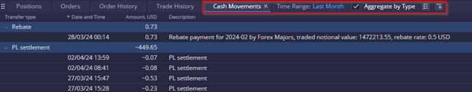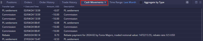 The Cash Movements widget provides information on cash transactions related to trading activities, deposits, withdrawals, commissions, and more.
