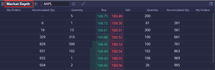 The Market Depth widget allows users to monitor market depth information for a particular instrument.