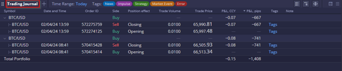 The Trading Journal widget provides users with a platform to meticulously track their trading decisions, including trade executions and the application of protection orders, serving as a personalized trading diary. It displays trade history with key details like symbol, date, order ID, side, type, volume, price, and P&L in both account currency and pips, calculated as (Close Price – Open Price) / Pip Size. Users can add tags and notes for filtering and analysis, customize columns, and view aggregated buy/sell orders. The widget also offers collapsible views for closed positions.