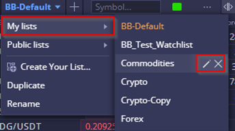 This button displays the watchlists you've created. You can rename a watchlist by clicking the pen button and delete it by clicking the "x" button.