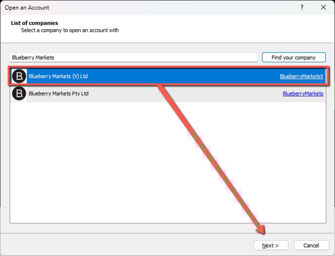 - Select "Blueberry Markets (V) Ltd" and click "Next"
