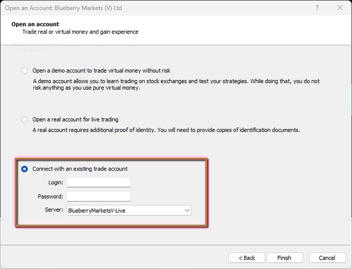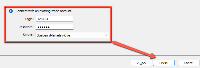 - From the "Connect with an existing trade account" field, you will notice that the server is BlueberryMarketsV-Live.