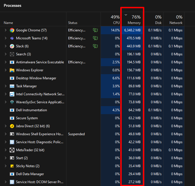 2. Select the Processes tab and take a look at the Memory tab. Here you’ll find the programs running on your computer that are quite “heavy”. Ideally, your memory usage should average no more than 90% for optimum performance.