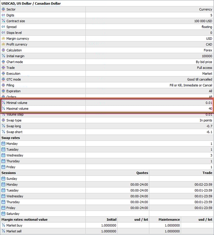 Other products may have different specifications. To check this on the platform, simply right-click the symbol in ‘Market Watch’ > Specification > Minimal/Maximal volume.