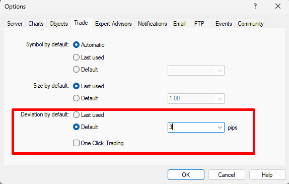 2. In the Trade tab, click Default under Deviation by default, then enter a number greater than zero in the pips field.