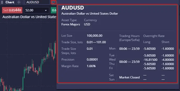 - Trading symbol info area (ขอมลสญลกษณการซอขาย) แสดงขอมลสาคญของ สนทรพย เชน ขนาดลอต, อตรามารจน, เวลาทาการ, คาสวอป