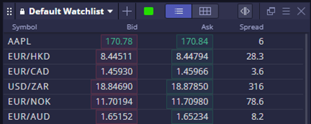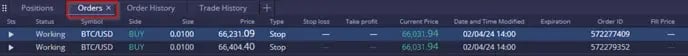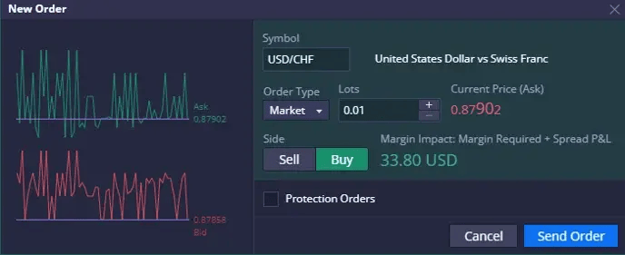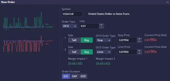 - แบบฟอร์มคำสั่งซื้อใหม่ประกอบด้วยรายละเอียดต่างๆ เช่น สัญลักษณ์ที่ซื้อขายและประเภทคำสั่งซื้อ พร้อมตัวเลือกสำหรับ Market, Limit, Stop หรือ OCO (อันหนึ่งยกเลิกอีกอันหนึ่ง) คำสั่งซื้อ OCO เชื่อมโยงคำสั่งซื้อสองรายการ โดยการดำเนินการคำสั่งซื้อรายการหนึ่งจะยกเลิกอีกรายการโดยอัตโนมัติ