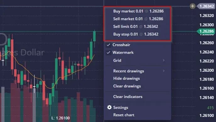 - Trading from Chart (การสงคาสงจากกราฟ) ผใชงานสามารถสงคาสงซอขายโดยตรงจาก กราฟไดโดยเปดใชงานฟเจอร “Trading from chart” (ไปท Chart settings > Trading > Trading from chart = True)